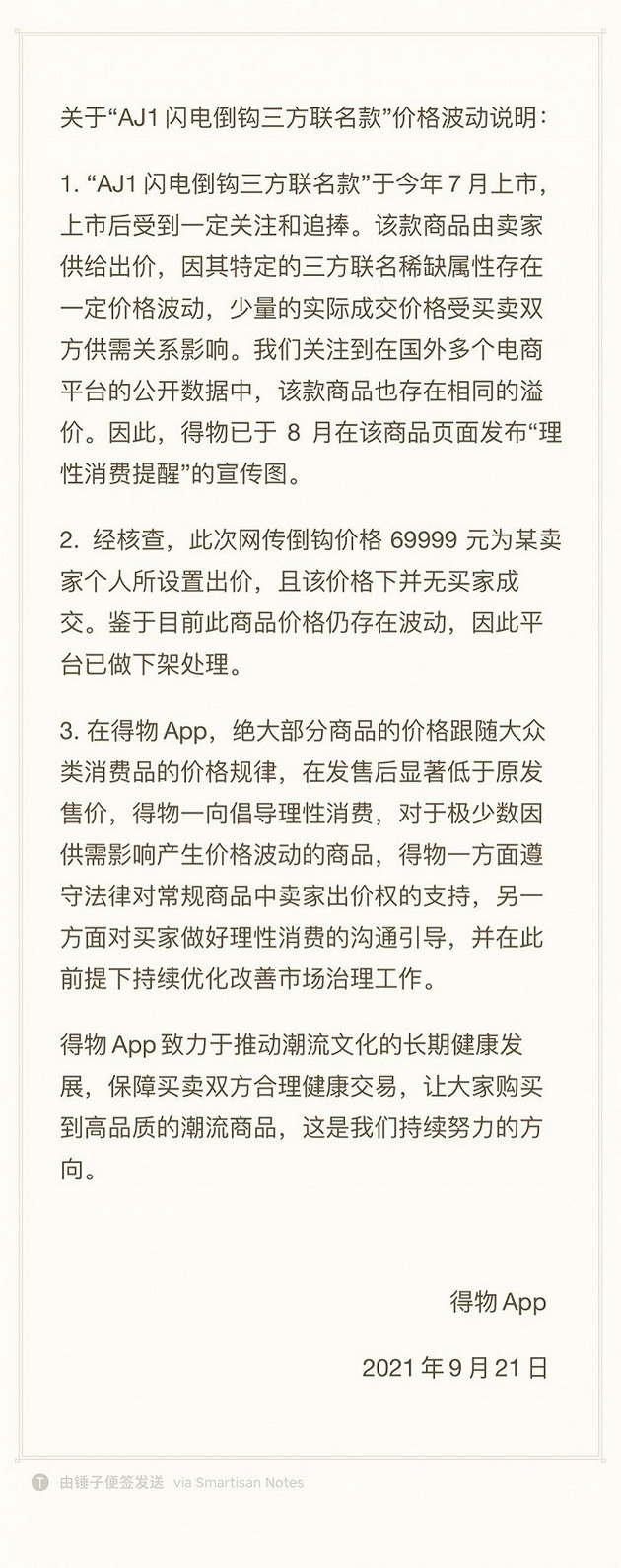 IT之家 9 月 21 日消息 9 月 21 日,得物 App 发布《关于“AJ1 闪电倒钩三方联名款”价格波动说明》。得物表示,经核查,此次网传倒钩价格 69999 元为某卖家个人所设置出价,且该价格下并无买家成交。鉴于目前此商品价格仍存在波动,因此平台已做下架处理。
