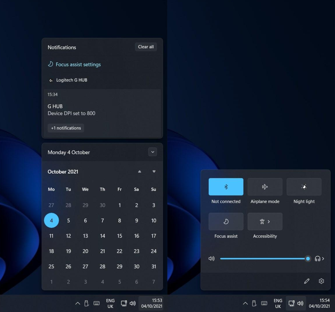 通知中心在 Windows 11 中也做了一些微小的改进工作:Windows 11 版本的通知中心被分为了通知与系统设置两部分,设置部分可以直接通过点击 Wi-Fi、音量/亮度等按钮调节,Wi-Fi 则会展开一个新的选择界面,不必再跳转到设置中设置。