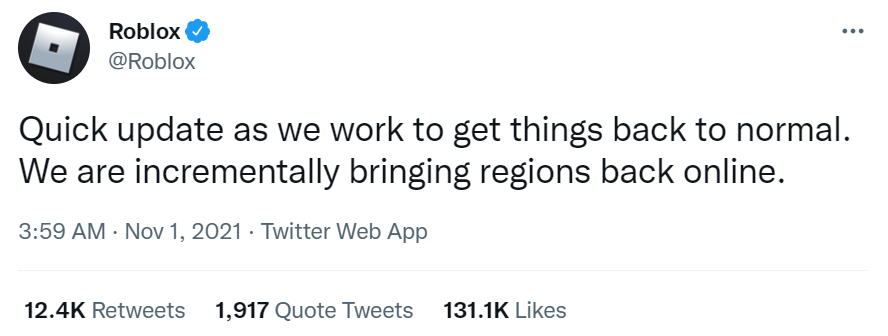 IT之家了解到,Roblox 今日凌晨通过 Twitter 表示,正在“逐步让各地区重新上线”。