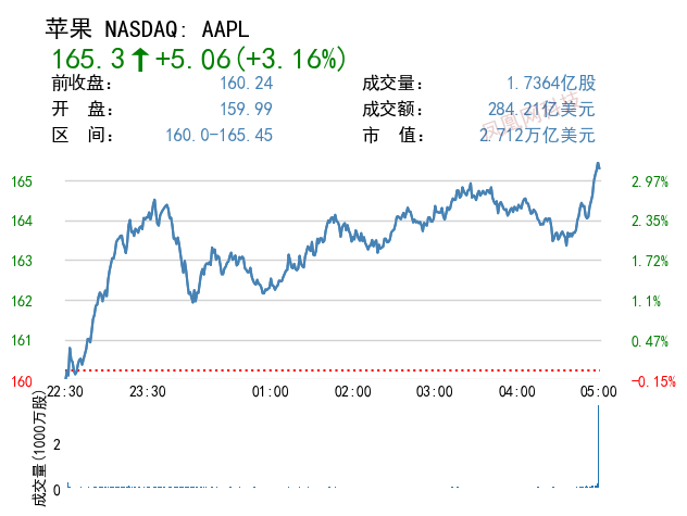 由于投资者担忧奥密克戎变异株的影响,今天美股大跌,但苹果逆势而涨,常规交易中涨 5.06 美元,涨幅为 3.16%,报收于 165.3 美元,在大盘科技股中表现突出,这表明,在市场不确定性加剧的情况下,投资者将它看成“避风港”。